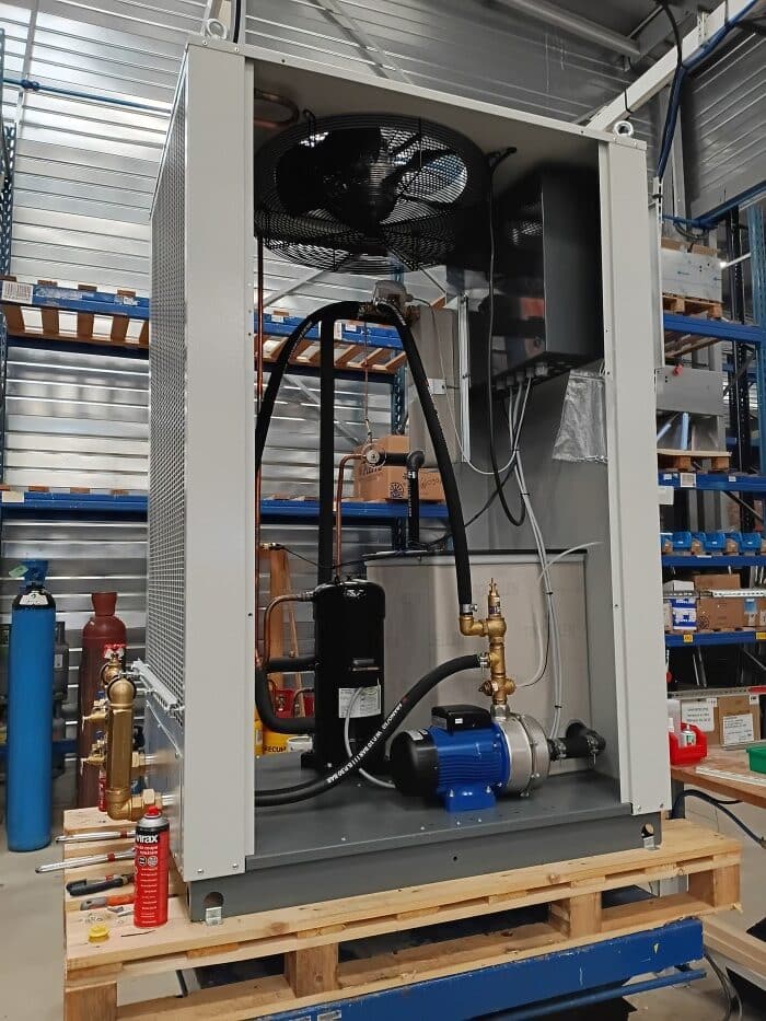 Ici en exemple : montage d’un ensemble comprenant un refroidisseur d’eau TRA 200, associé à un échangeur fin de ligne ECH 100 (permettant de découpler le circuit pour gestion optimale de l’antigel) pour le Laboratoire de Physique des 2 infinis.