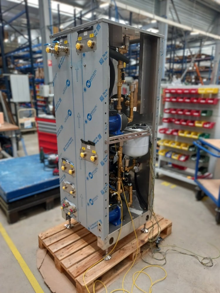 Ici par exemple : un ECH 60, en cours de montage, réalisé spécialement pour le process de gestion du chocolat (circuit d’acheminement au poste et circuit maintient en température des cuves) :