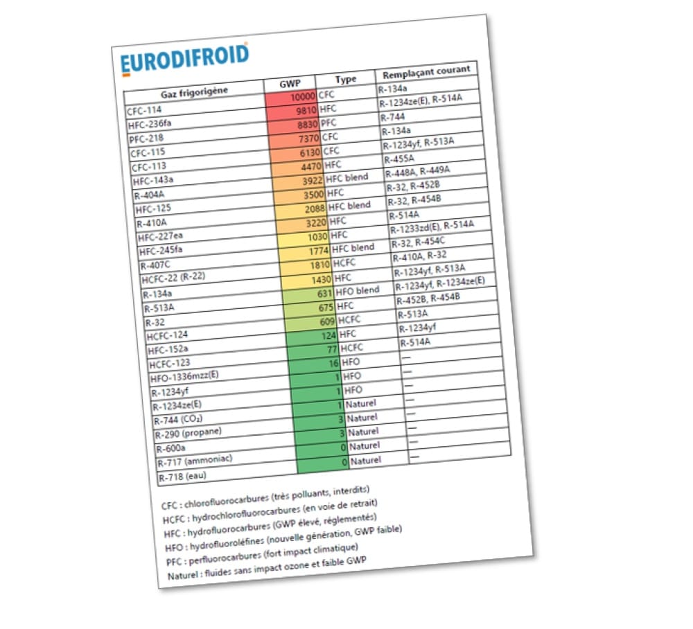 First thing to know: the GWP (Global Warming Potential) index of each gas. In fact, this index classifies fluids according to their environmental impact (lifespan, warming potential, etc.).