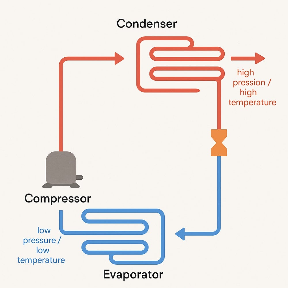 The principle of a refrigerant circuit is based on a thermodynamic cycle allowing heat to be transferred from one place to another — typically to cool a space or an object (as in a refrigerator, an air conditioner, or a heat pump).