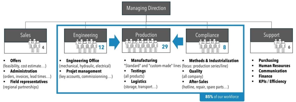 - Upstream of PRODUCTION, a complete ENGINEERING platform, bringing together all the required skills (mechanical, electrical, programming, hydraulic, refrigeration…) is structured around Project Managers and Business Managers, who will be coordinators and privileged interlocutors during the product development phases;