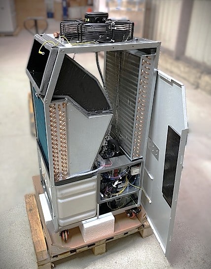 Quelques petites semaines plus tard, nous livrons ce RFI 100 (8 kW puissance frigorifique / 9 kW puissance de chauffe), intégrant un compresseur Bitzer fonctionnant avec gaz HFO à faible émission R1234ze, un réservoir de 100 litres en inox, un automate de pilotage (sondes, vanne 3 voies, régulation de la ventilation, pompe de circulation…) avec connexion TCP/IP.