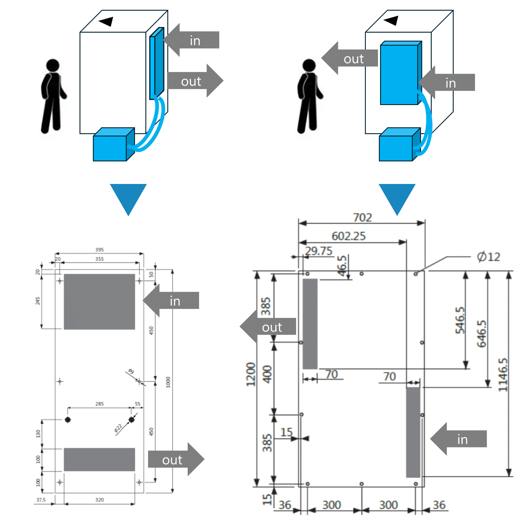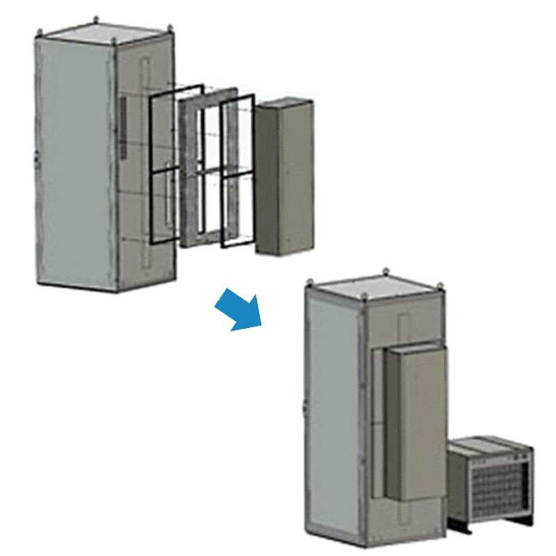 Et, sur nos climatiseurs CIT 30 ou CIT 50, nous vous offrons aussi la possibilité d’un montage avec circulation d’air « arrière vers avant » dans l’armoire (voir schéma ci contre).