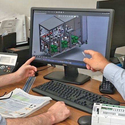 Un skid hydraulique est un module préfabriqué qui regroupe en un seul châssis (le « skid ») tous les composants hydrauliques nécessaires au bon fonctionnement d’une installation de refroidissement (ou de chauffage).On y retrouve généralement (variable selon les cas) : les pompes de circulation, les vannes (d’arrêt, de régulation, de sécurité), les réservoirs tampons (ou cuves), des by-pass et un automatisme de pilotage.