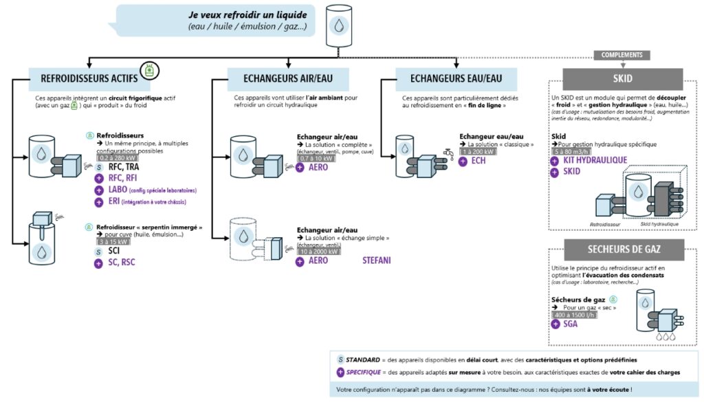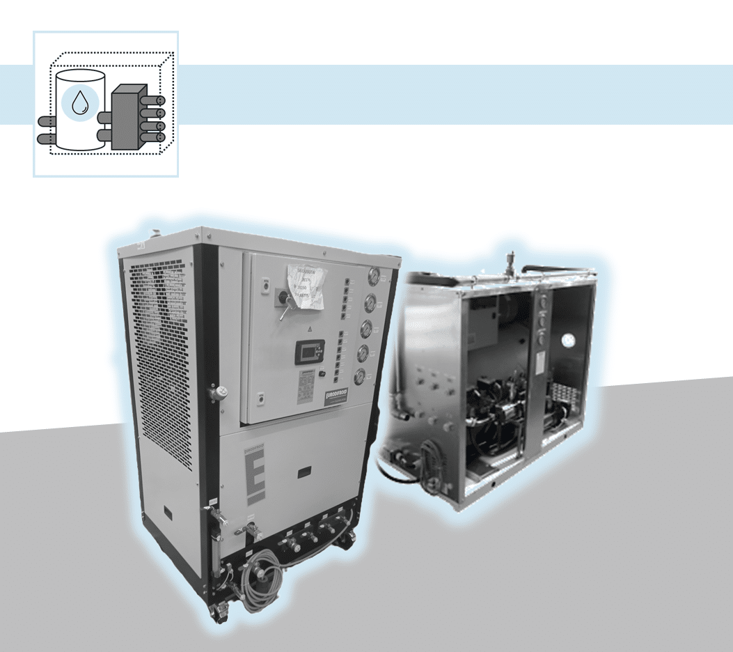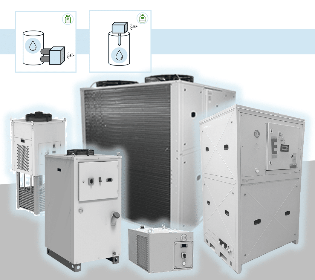 Par ailleurs, nous proposons aussi des solution de refroidissement par échangeur Air/Eau ou Eau/Eau qui, au lieu d’intégrer un circuit frigorigène avec un gaz, vont utiliser soit une source d’air froid, soit une source d’eau froide pour refroidir votre process.
